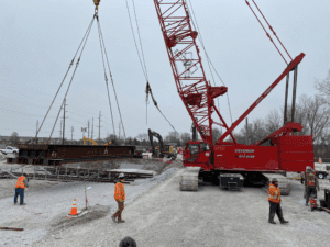 During a precise 12-hour track closure, crews installed two temporary jump spans. The contractor, FH Paschen, completed key activities, including foundation and earth retention system installation, open deck track panel assembly, and track reinstallation following the jump span placement. These temporary spans will allow construction to progress on the north and south permanent bridge abutments while keeping railroad operations active.