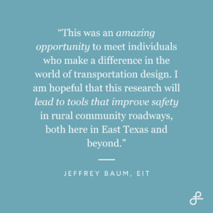 Jeff shared, “This was an amazing opportunity to meet individuals who make a difference in the world of transportation design. I am hopeful that this research will lead to tools that improve safety in rural community roadways, both here in East Texas and beyond.”