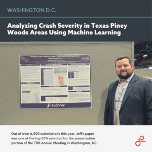 Jeff’s work, titled “Analyzing Crash Severity in Texas Piney Woods Areas Using Machine Learning,” was submitted to the Transportation Research Board (TRB), an esteemed part of the National Academies of Sciences, Engineering, and Medicine. Out of over 6,000 submissions this year, Jeff’s paper was one of the top 50% selected for the presentation portion of the TRB Annual Meeting in Washington, DC. Additionally, Jeff has been chosen for publication in the TRB’s prestigious Transportation Research Record (TRR), and will have one of the select few academic works to be published by the TRB itself.