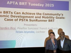 During the conference’s BRT Workshop, Taiwo co-presented with our Pinellas Suncoast Transit Authority (PSTA) client, Darden Rice. Their session, How BRTs Can Achieve the Community’s Economic Development and Mobility Goals, explored how BRT can deliver more efficient, reliable, and accessible service in communities of all sizes. Their session also entailed lessons learned from the PSTA SunRunner—Tampa’s first BRT service and 2024 APTA Excellence in Inclusion Award recipient.