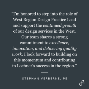 Please join us in congratulating Stephan Verberne, PE, on his promotion to Design Practice Lead for Lochner’s West Region.